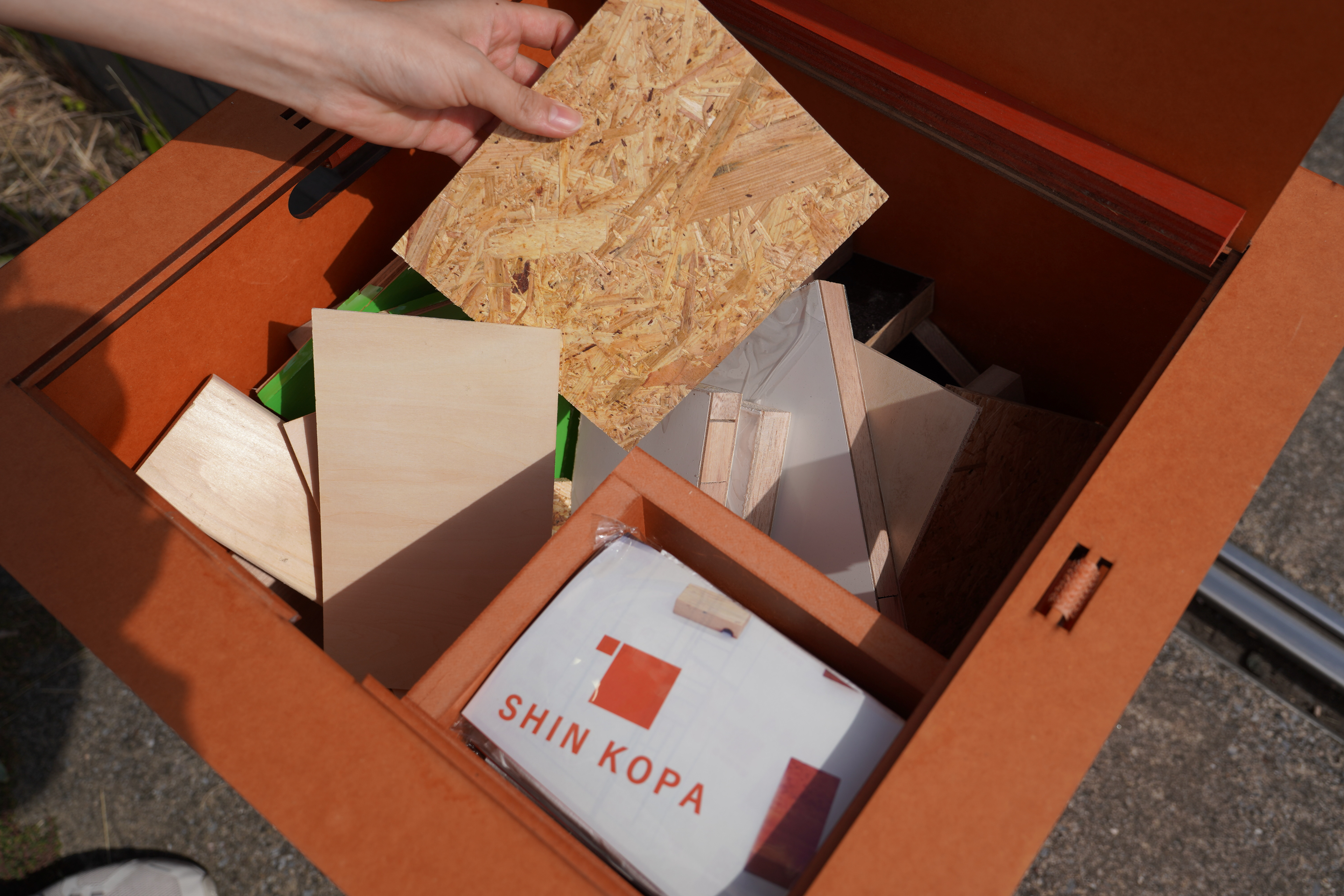 Shinkopa is a project that installs “wood‐scrap take-home only” bins in front of lumberyards in Shin-Kiba, offering visitors an experience of freely collecting offcuts as they tour the yards. Each bin is stocked with a dedicated bag and an area map, so participants can wander Shin-Kiba with a map in hand, gathering their favorite scraps while experiencing the town and its lumber industry firsthand. By reframing offcuts not as “waste” but as “local recyclable resources,” Shinkopa highlights and shares the unique charm of Shin-Kiba.